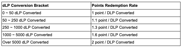 During the dLP RUSH event, participants will accumulate points based on their dLP conversion, with a higher conversion amount providing more points. Users can unlock higher brackets of points per dLP by converting more dLP. dLP converters will receive varying amounts of RDP rewards based on the different points brackets they reach.